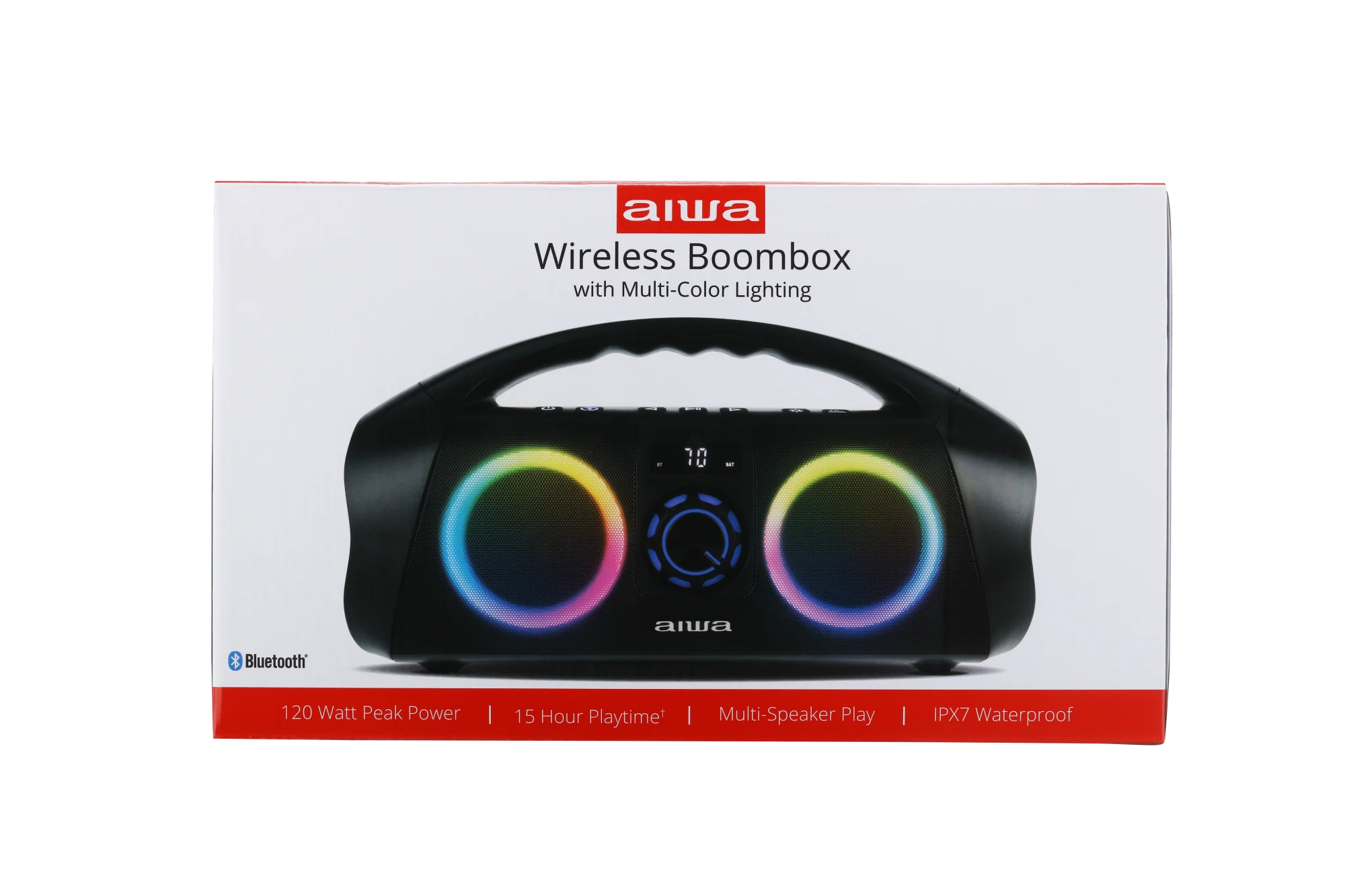 The Aiwa Wireless Boombox is the ultimate outdoor speaker for any occasion! With an IPX7 waterproof rating as well as 120 watts of peak power you can enjoy this speaker from anywhere. With 15 hours of playtime you can enjoy your tunes all day long! Charge fast with USB-C. 7 multi-color LED light modes will fit any party. Enjoy the sound from all angles with omnidirectional sound! Its design allows for music to flow from all directions, surrounding everyone in booming sound. Connect multiple Wireless Boomboxes together and enjoy surround sound with True Wireless Pairing.