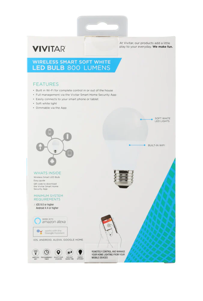 The Vivitar 800 Lumens/60 Watt Smart Soft White LED bulb is ideal for your home. Whether a party or a candlelit dinner, this LED bulb is sure to set the perfect ambience by allowing you to dim the light via the app. Control the LED bulb straight from your smartphone from anywhere with a single click using the Vivitar Smart Home Security App. IOS, Android, Alexa, Google Home & IFTT/Nest compatible.